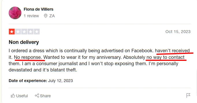 This reviewer ordered a dress but has not received it and has not been able to contact the company.